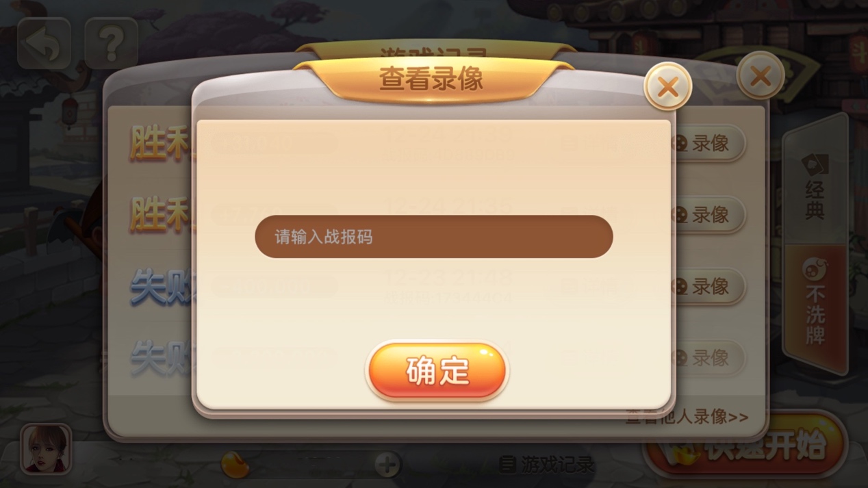 进入96益智分类,点击《经典对战》,进入“经典玩法”或“不洗牌”,点击右下角的“游 戏记录详情“——点击弹窗右下角文字链接“查看他人录像”——输入战报码,就可以查看他人的游 戏录像了。无论你想向大神学习,还是回顾每一局对战,都可以通过上述方法找到录像。