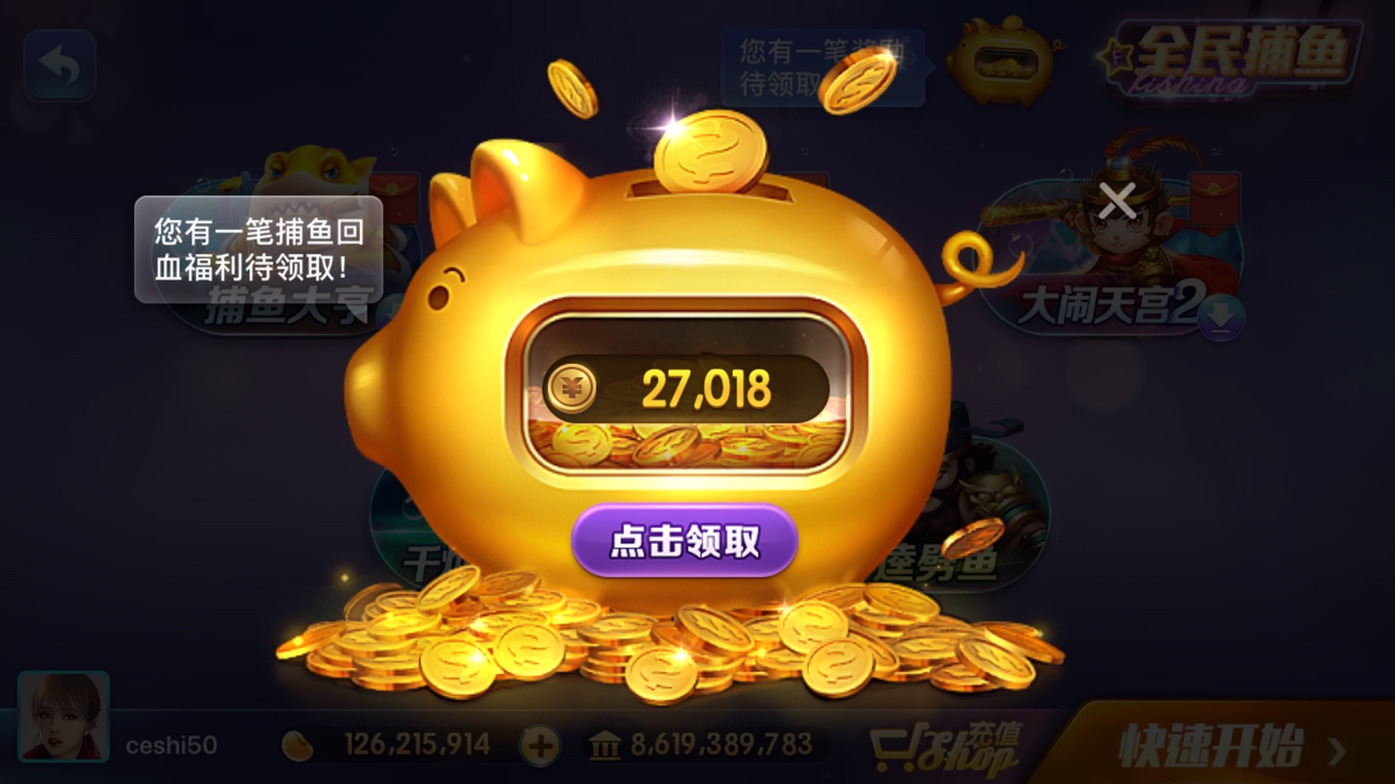玩 家在捕鱼游 戏中消耗的金 币,会按一定比例返还到金猪中。点击主界面的金猪图标即可开始砸金猪。捕鱼的场次越高,返还比例越高。当你发现小金猪出现的时候,轻轻一点可以砸出金豆,奖 励将自动进入玩 家银行。