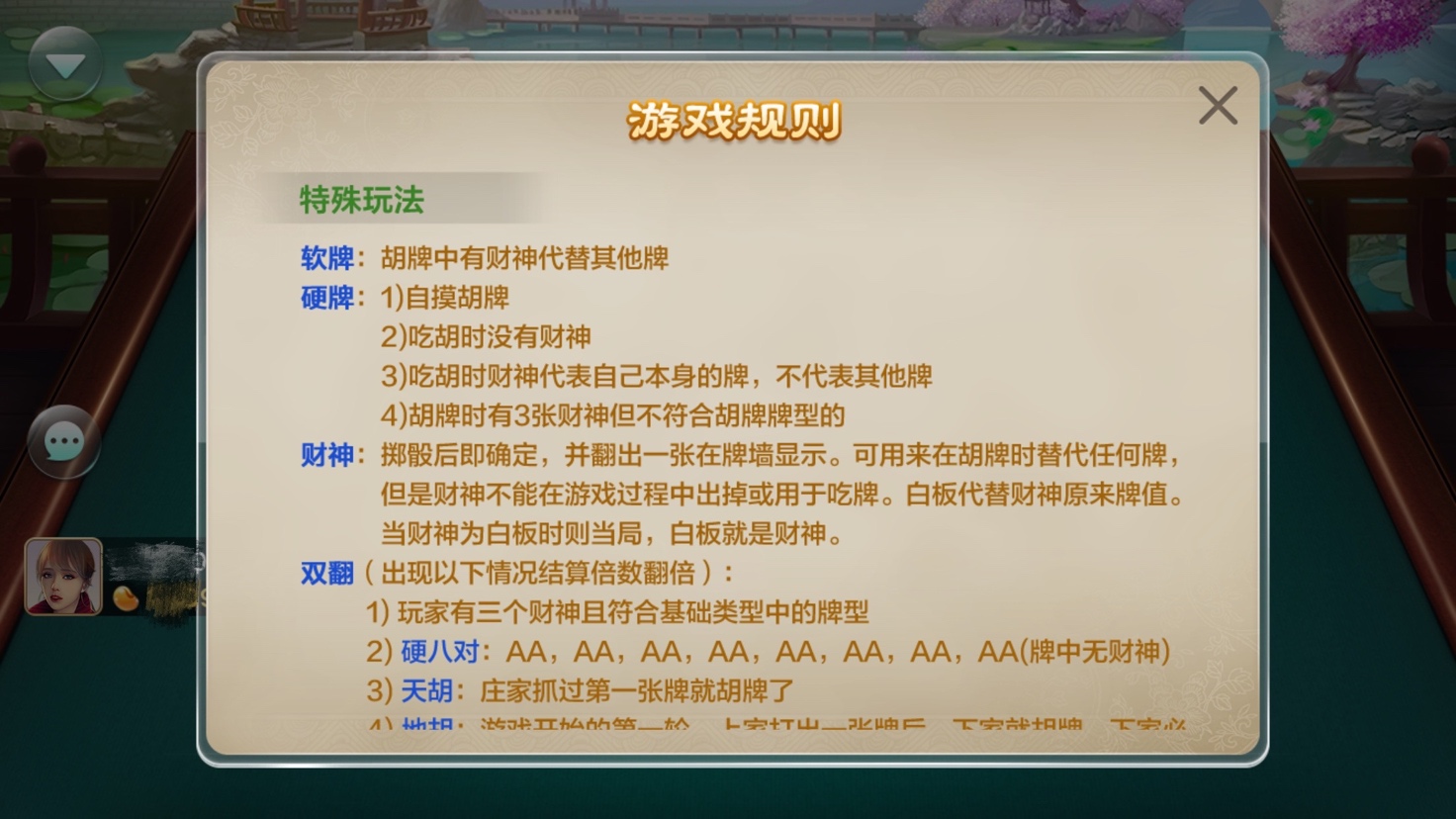 【财神】可用来在和牌时替代任何牌。财神牌型在桌上亮出(翻牌就是财神)。白板代替财神牌。