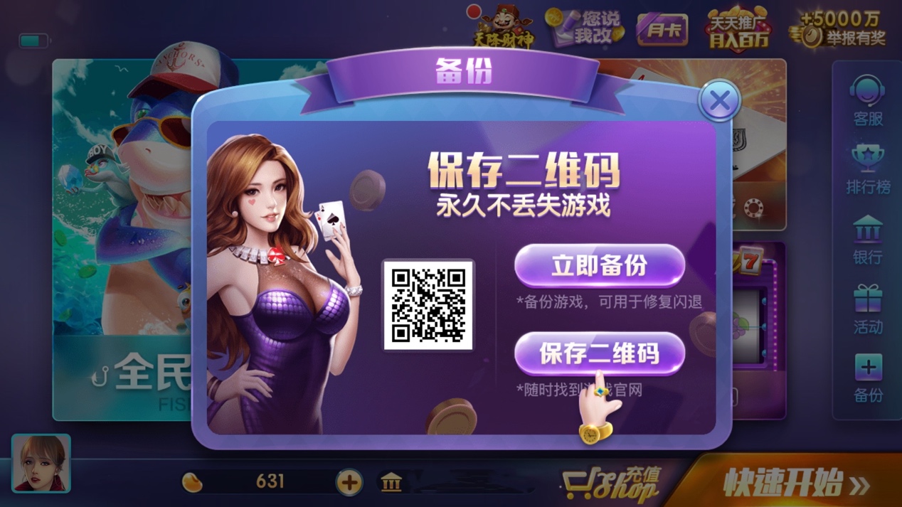 96首页——点击右下角“备份”——点击“保持二维码”,永久不不丢失游 戏。