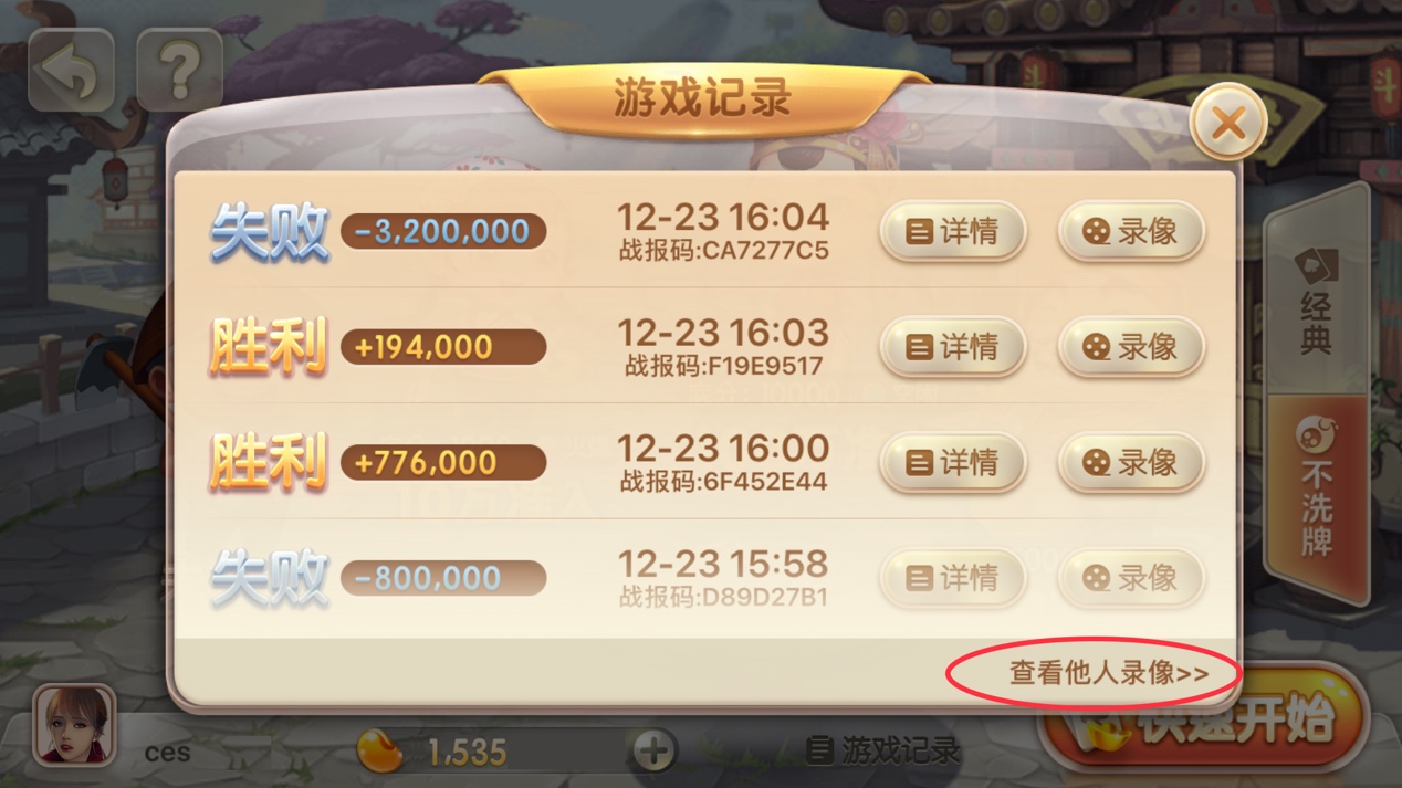 进入96益智分类,点击《经典对战》,进入“经典玩法”或“不洗牌”,点击右下角的“游 戏记录详情“——点击弹窗右下角文字链接“查看他人录像”——输入战报码,就可以查看他人的游 戏录像了。无论你想向大神学习,还是回顾每一局对战,都可以通过上述方法找到录像。